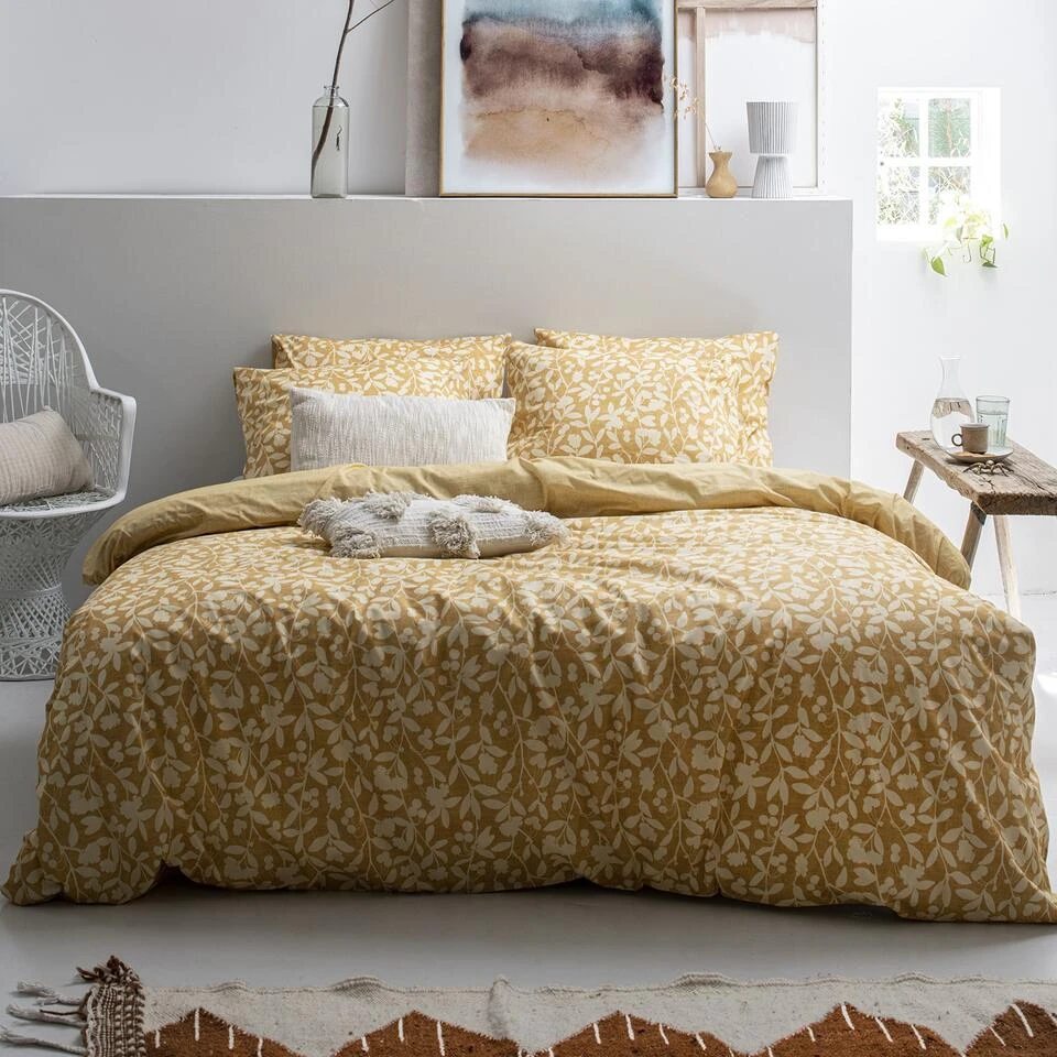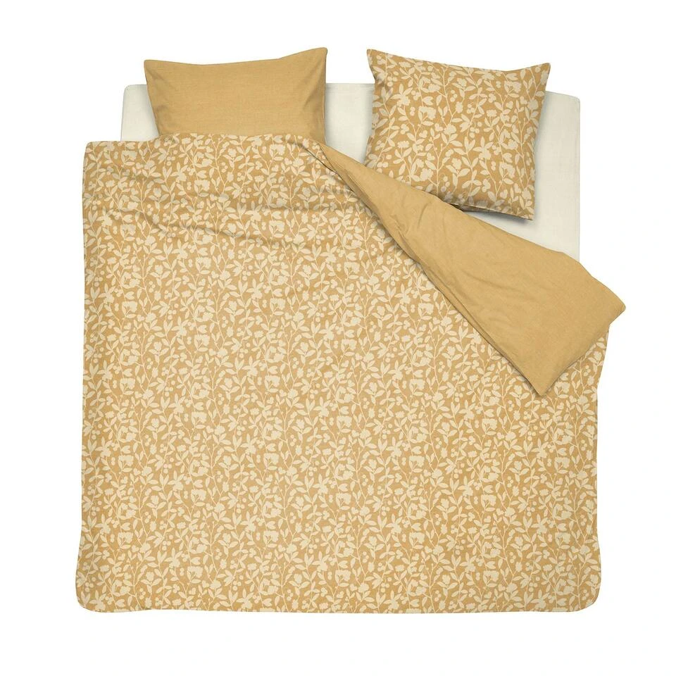 Het Cinderella dekbedovertrek Linde is voorzien van een all-over dessin van subtiele bloesemtakjes in een zachte gele kleur. De ondergrond lijkt op een open weefsel wat perfect aansluit op deze Scandinavische en serene stijl. Het dekbedovertrek is double-face; de achterkant heeft een effen kleur met een linnen effect.